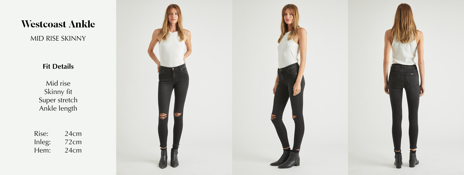 The Eastcoast Ankle is a high rise, skinny fit jean in super stretch denim. Features classic Rolla's detailing, including our iconic signature back pocket shape and stitching. Every detail has been adjusted for the sleekest, most flattering fit. We use premium fabrics for maxiumum hold that won't lose shape.
